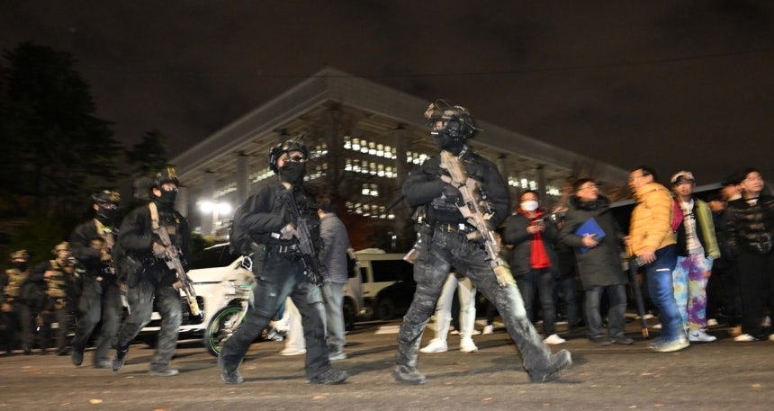 | 12·3 비상계엄 이튿날인 작년 12월 4일 새벽 서울 여의도 국회의사당에서 비상계엄 해제 요구 결의안이 가결되자 군병력이 철수하고 있다. [이상섭 기자] |