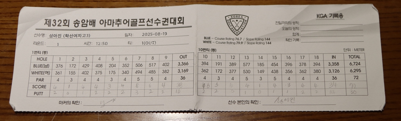 | 하루 2개의 홀인원을 작성한 성아진의 스코어 카드 [대한골프협회 제공] |