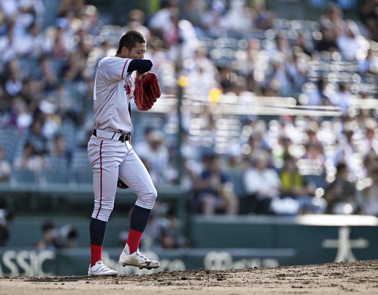 | 교토국제고의 투수 니시무라 잇키가 19일 일본 효고현 니시노미야시 한신고시엔 야구장에서 열린 여름 고시엔 8강전에서 땀을 닦고 있는 모습 [연합] |