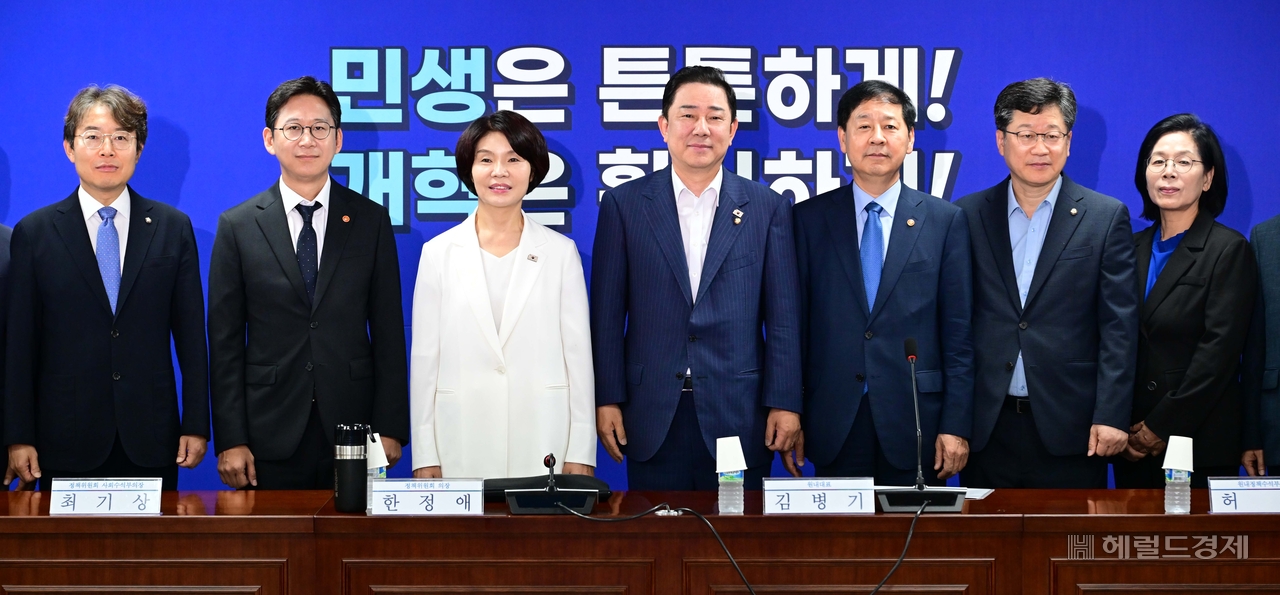 [헤럴드pic] 기념촬영하는 김병기 원내대표와 구윤철 경제부총리 글꼴 선택 본문 텍스트 크게본문 텍스트 작게 인쇄 [헤럴드경제=이상섭 기자] 김병기 더불어민주당 원내대표와 구윤철 경제부총리 겸 기획재정부 장관 등이 20일 오전 서울 여의도 국회의원회관에서 열린 새정부 경제성장전략 관련 당정협의에서 기념 촬영을 하고 있다. 왼쪽부터 민주당 최기상 정책위 수석부의장, 배경훈 과학기술정보통신부 장관, 한정애 정책위의장, 김 원내대표, 구 부총리, 안호영 국회 환경노동위원장, 최민희 과학기술정보방송통신위원장.