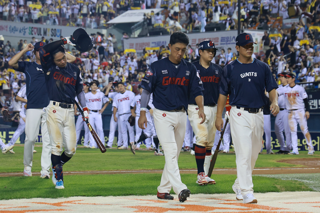 | 롯데 선수들이 20일 LG 트윈스전에서 3-5로 패해 22년 만에 10연패를 기록한 뒤 그라운드를 나서고 있다. [연합] |
