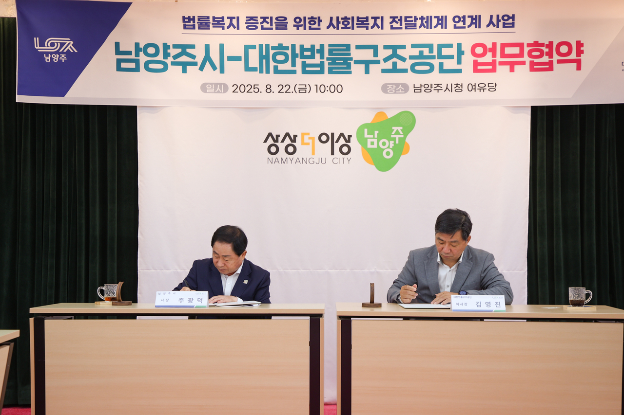 [헤럴드경제=박준환 기자]남양주시(시장 주광덕)가 22일 시청 여유당에서 대한법률구조공단(이사장 김영진)과 경기도 최초로 법률지원 서비스 체계 구축을 위한 업무협약을 체결했다.