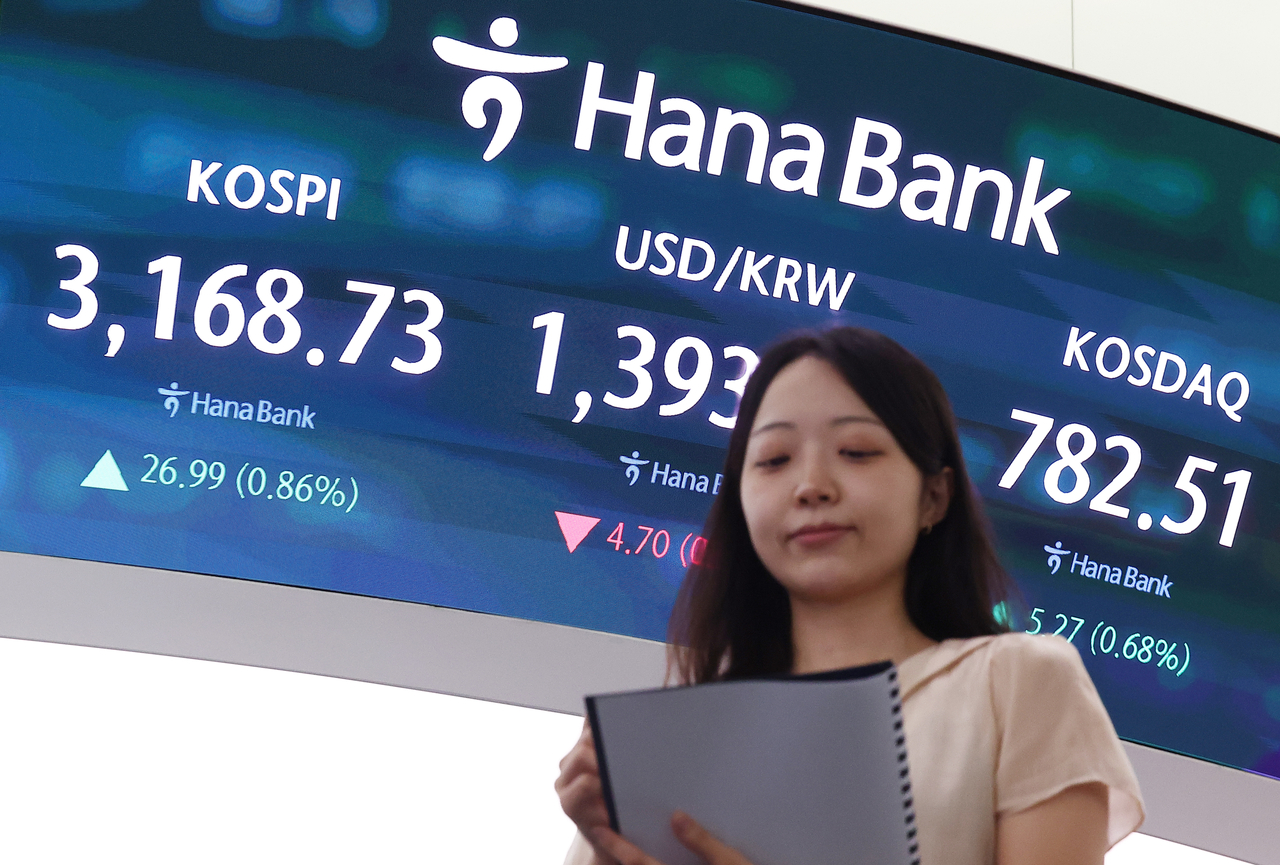 | 22일 오후 서울 중구 하나은행 본점 딜링룸 현황판에 코스피 지수, 원/달러 환율, 코스닥 지수가 표시돼 있다. 이날 코스피 지수는 전 거래일보다 26.99포인트(0.86%) 오른 3168.73으로, 코스닥 지수는 전장보다 5.27포인트(0.68%) 오른 782.51으로 마감했다. [연합] |