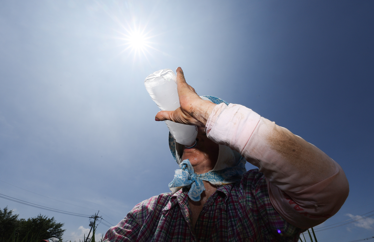 | 경북 고령군 다산면의 한 밭에서 파 모종을 심던 농민이 얼음물을 마시며 더위를 식히고 있다. [연합] |