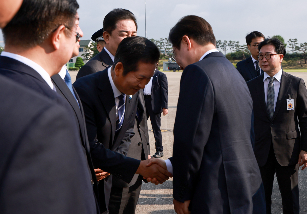 | 일본·미국 순방에 나서는 이재명 대통령이 23일 성남 서울공항에서 환송 나온 더불어민주당 정청래 대표와 악수하고 있다. [연합] |