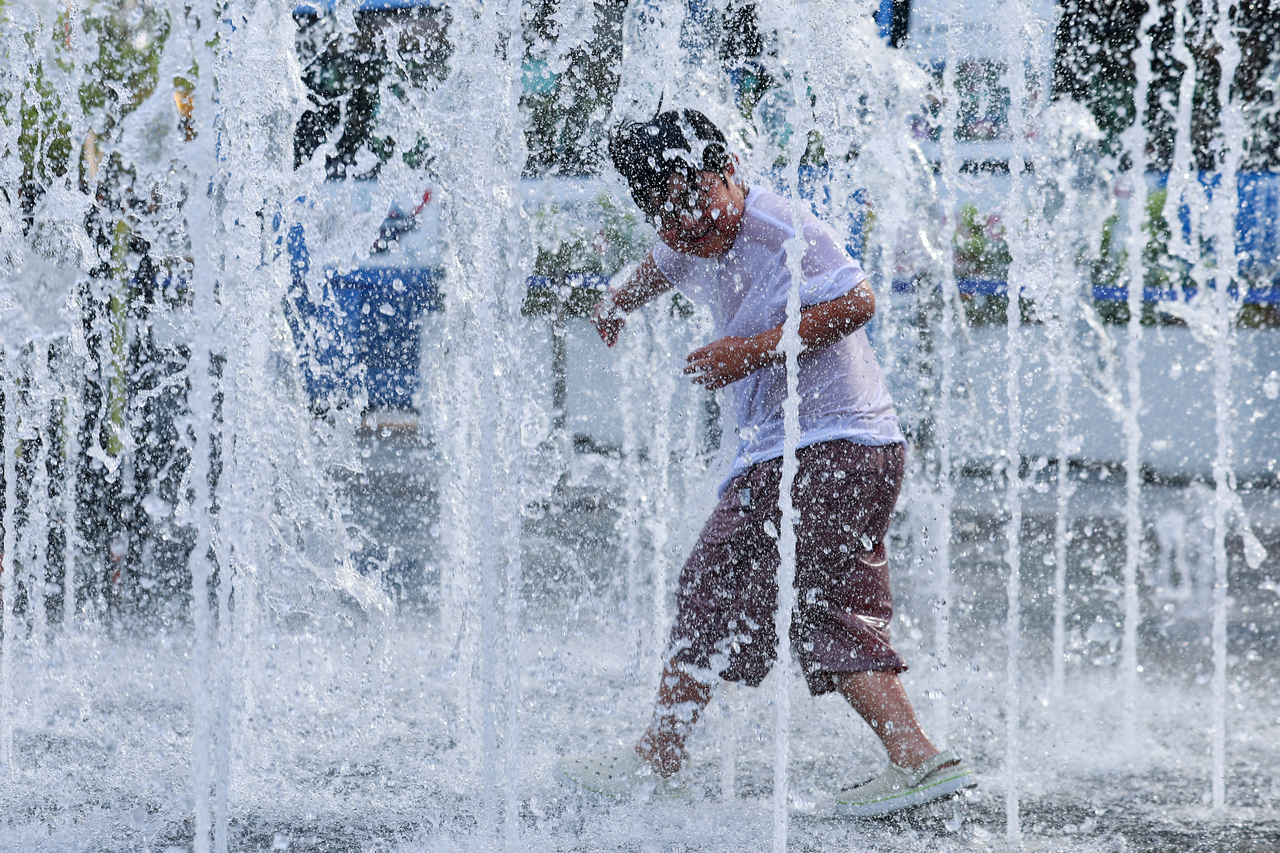 | 서울 종로구 광화문광장 분수대에서 한 어린이가 물놀이를 즐기고 있다. [연합] |