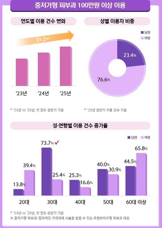 여성 이용률은 올 상반기 기준 76.6%로 여전히 대다수를 차지하고 있다. 다만, 최근 2년간의 이용 건수 변화를 보면 30대 남성의 이용이 73.7% 늘어나면서 가장 큰 증가율을 보였다. 외모도 하나의 ‘스펙’으로 여겨지면서 제모, 레이저 치료 등 외모 관리에 젊은 남성들의 지출이 많아졌다.