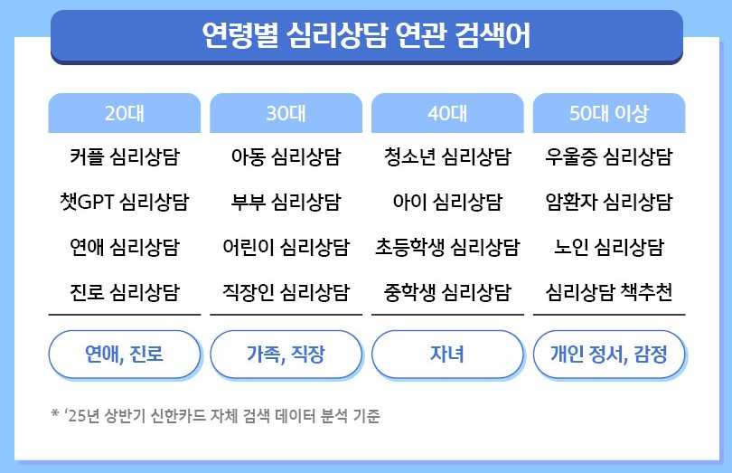 ‘마음건강’을 챙기려는 움직임도 늘고 있다. 올 상반기 정신건강의학과 이용 건수는 2023년 같은 기간 대비 11.4% 증가했다. 심리 상담에 대한 세대별 연관 검색어를 보면, 20대는 ‘진로’, ‘연애’에 대한 관심이 높았고, 30대는 ‘아동’, ‘부부’, ‘직장’ 등의 언급이 많았다.