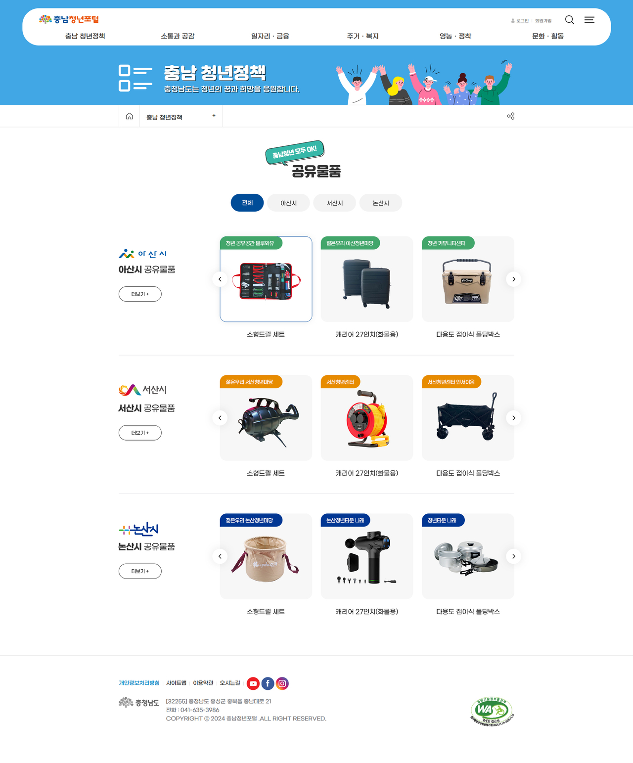 | 충남청년포털 생활공구 대여 페이지 화면(공유물품 전체 목록). |