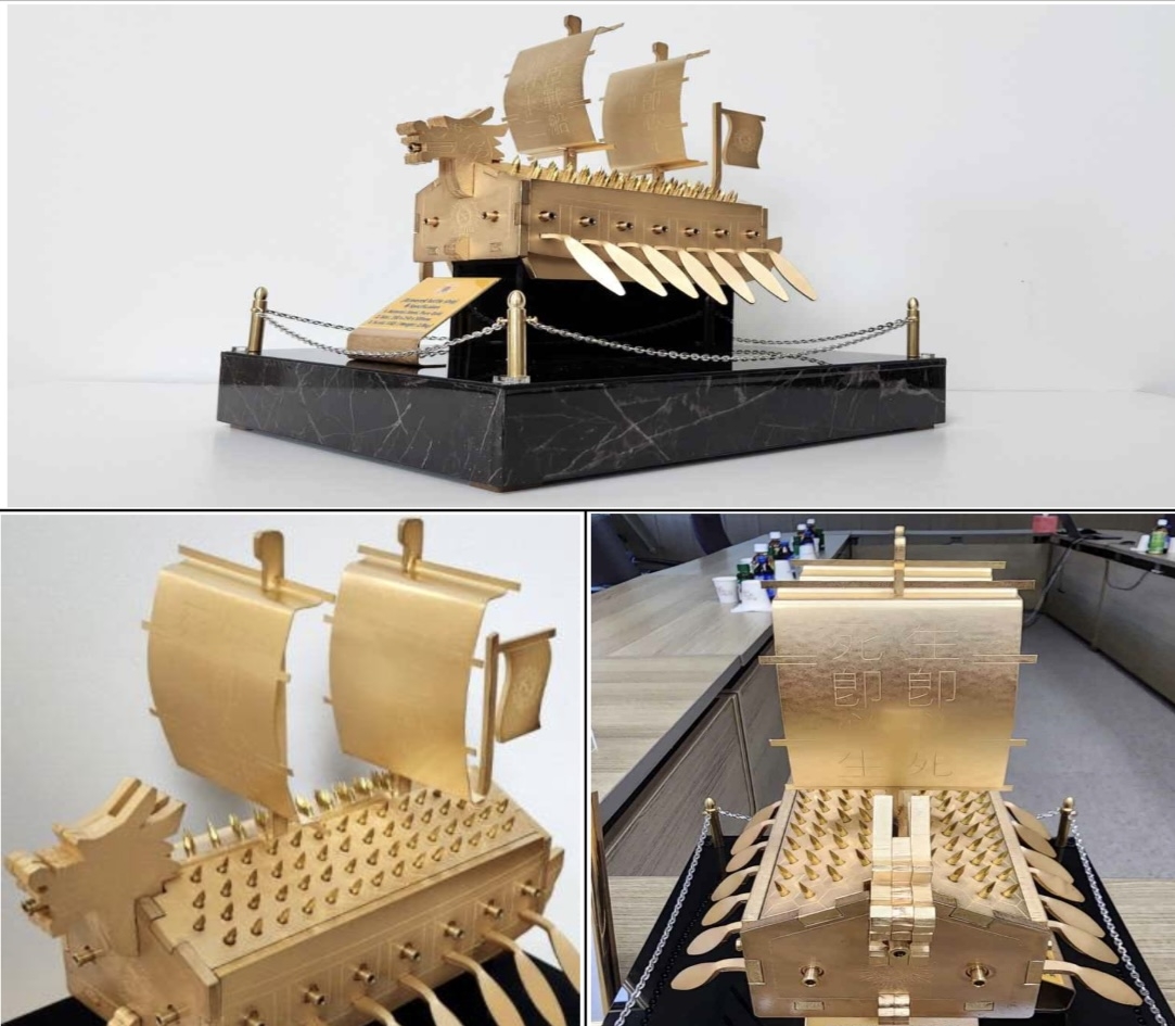 거북선 모형은 가로 30㎝·세로 25㎝ 크기로, 기계조립 명장인 HD현대 오정철 기장이 손수 제작했다. 대통령실 관계자는 “전통과 현대를 아우르는 우리 조선 기술의 우수성을 알리고자 했다”고 설명했다. 마가 모자는 트럼프 대통령이 이제까지 착용한 적이 없던 ‘카우보이 모자’ 형태로, 배우자 멜라니아 여사의 것까지 함께 제작해 선물했다.