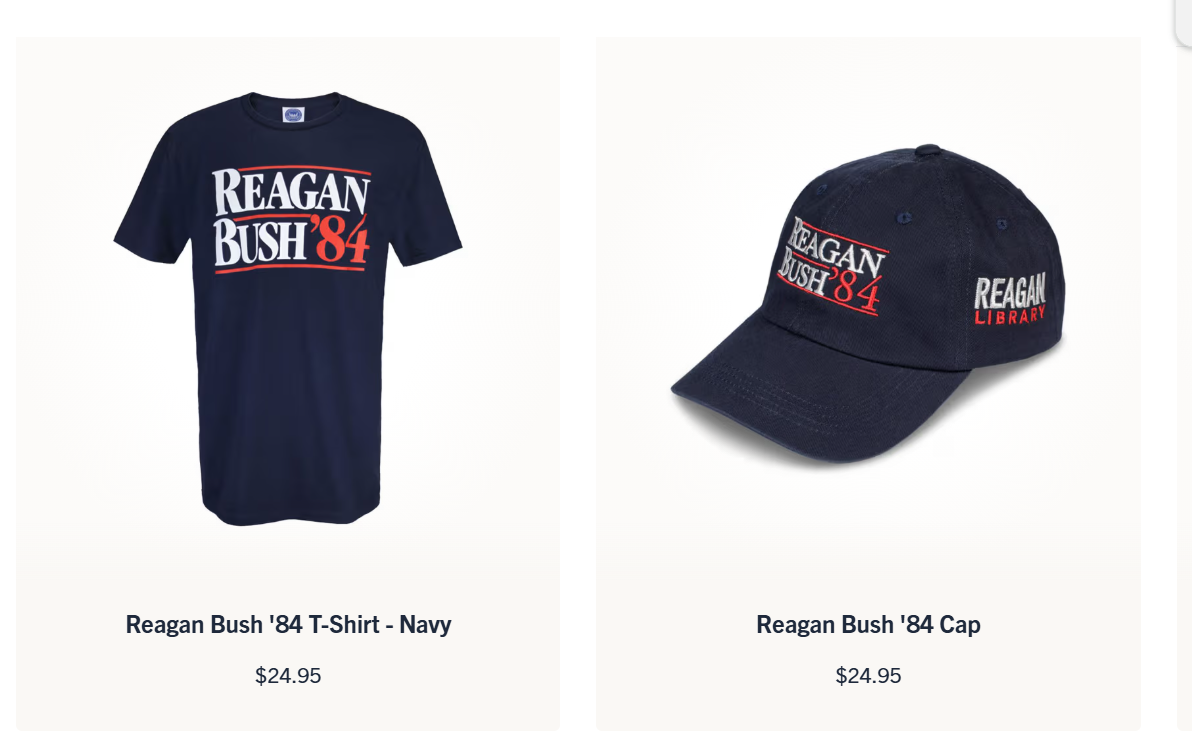 | ‘레이건·부시 84’ 티셔츠와 모자의 모습 [로널드 레이건 대통령 재단과 연구소 웹페이지 캡처] |