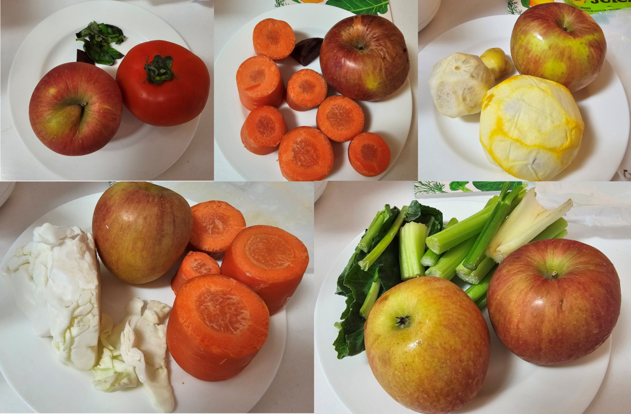 인기레시피인 ABC(사과·비트·당근), CCA(당근·양배추·사과), 진저레몬(레몬·생강·사과·오렌지), 바질 토마토(바질·토마토·사과·비트), 케일러리(셀러리·사과·케일) 등 5가지를 모두 만들었다. 전문가가 조합한 레시피라도 일단 맛이 없으면 자주 애용하기 어려울 터, 무엇보다 맛이 중요했다.