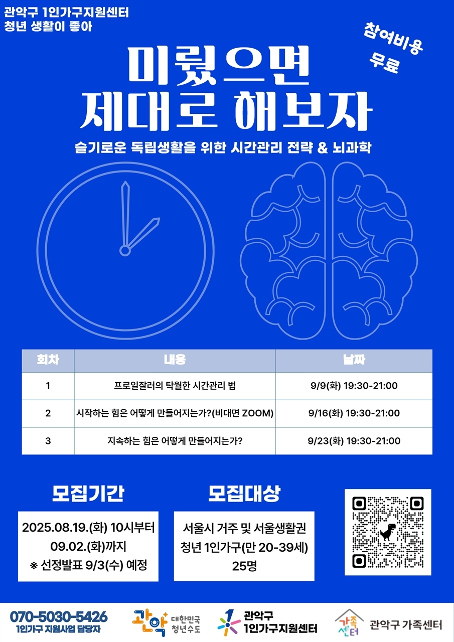 청년 시간관리 프로그램은 관악구1인가구지원센터에서 주관하며, 지난 5월 진행된 시간관리 1기의 뜨거운 호응에 따른 후속 프로그램으로 9월부터 2기가 시작된다.