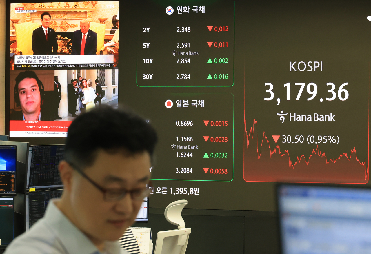 | 26일 서울 중구 하나은행 본점에서 직원들이 증시와 환율을 모니터하고 있다. 이날 코스피는 나흘 만에 하락 마감했다. 이재명 대통령과 도널드 트럼프 미국 대통령의 첫 정상회담이 성공적으로 마무리되는 호재가 있었으나 시장의 기대만큼 구체적 결과물이 나오지는 않은 까닭에 영향이 제한적이었던 것으로 보인다. 코스피는 전장보다 30.50포인트(0.95%) 내린 3179.36으로 거래를 마감했다. [연합] |