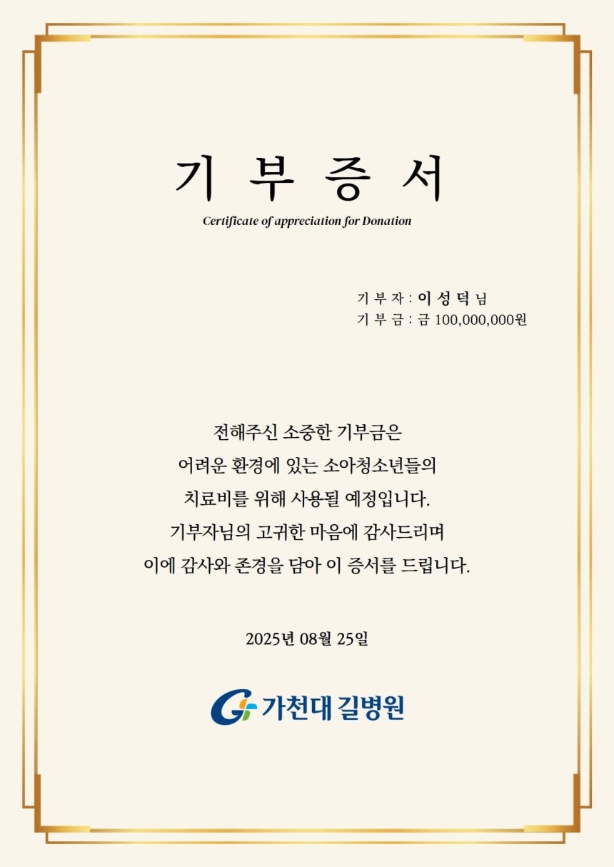 26일 가천대 길병원은 지난 21일 폐암으로 숨진 이성덕(63) 씨의 가족으로부터 1억원을 기부받았다고 밝혔다.