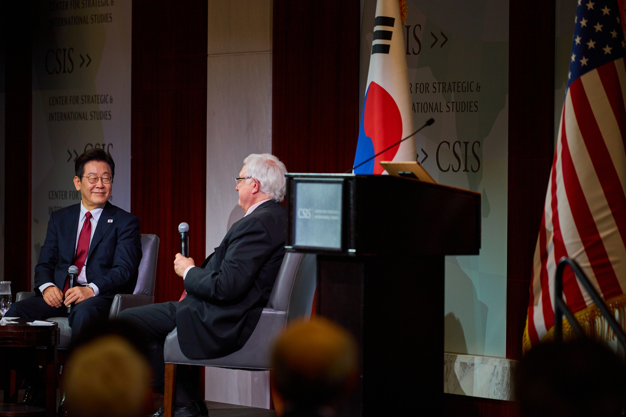 | 이재명 대통령이 25일(현지시간) 미국 워싱턴DC 국제전략문제연구소(CSIS) 인터내셔널 스튜디오에서 정책 연설을 마친 뒤 존 햄리 CSIS 소장과 대담을 하는 모습. [연합] |