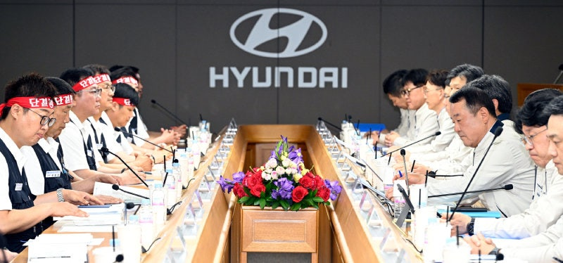 | 현대자동차 노사 관계자들이 지난 6월 18일 현대차 울산공장 본관에서 ‘2025년 임금 및 단체협상 교섭 상견례’를 하고 있다. [현대차 제공] |