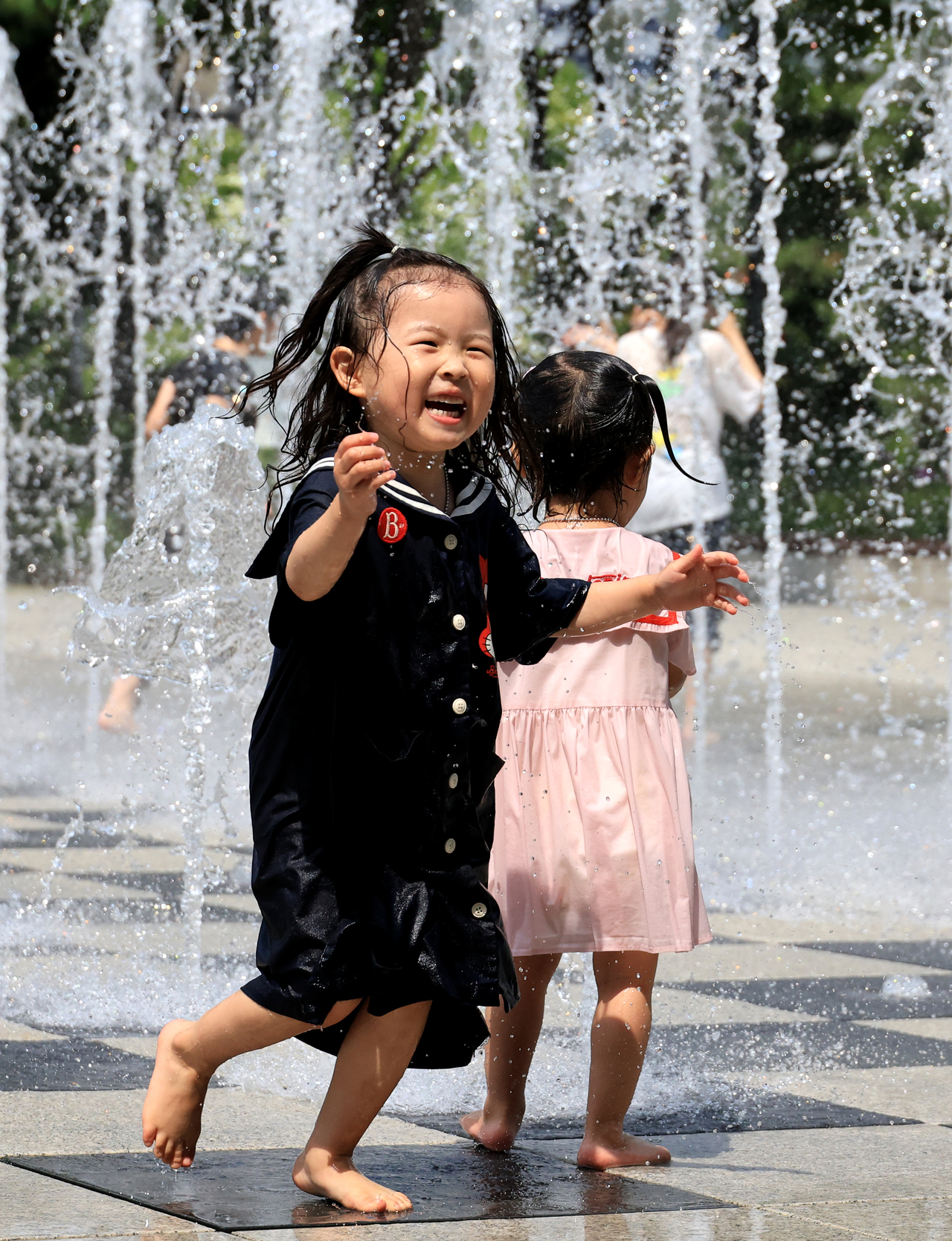 | 덥고 습한 공기 유입으로 찜통더위가 찾아온 가운데 어린이들이 분수 물줄기에 즐거워하고 있다. <연합뉴스> |