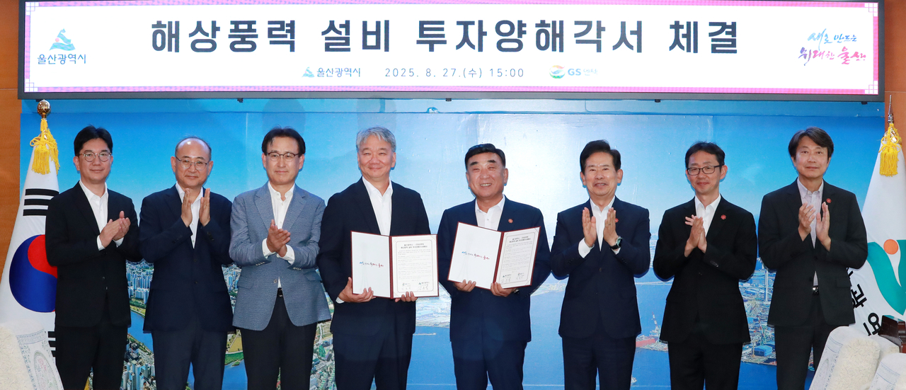 [헤럴드경제(울산)=박동순 기자] 울산시와 ㈜GS엔텍이 27일 울산시청 본관 7층 시장실에서 김두겸 시장과 정용한 ㈜GS엔텍 대표가 참석한 가운데 해상풍력 설비 투자협약을 체결하고 친환경 에너지 산업을 선도해 나가기로 했다.
