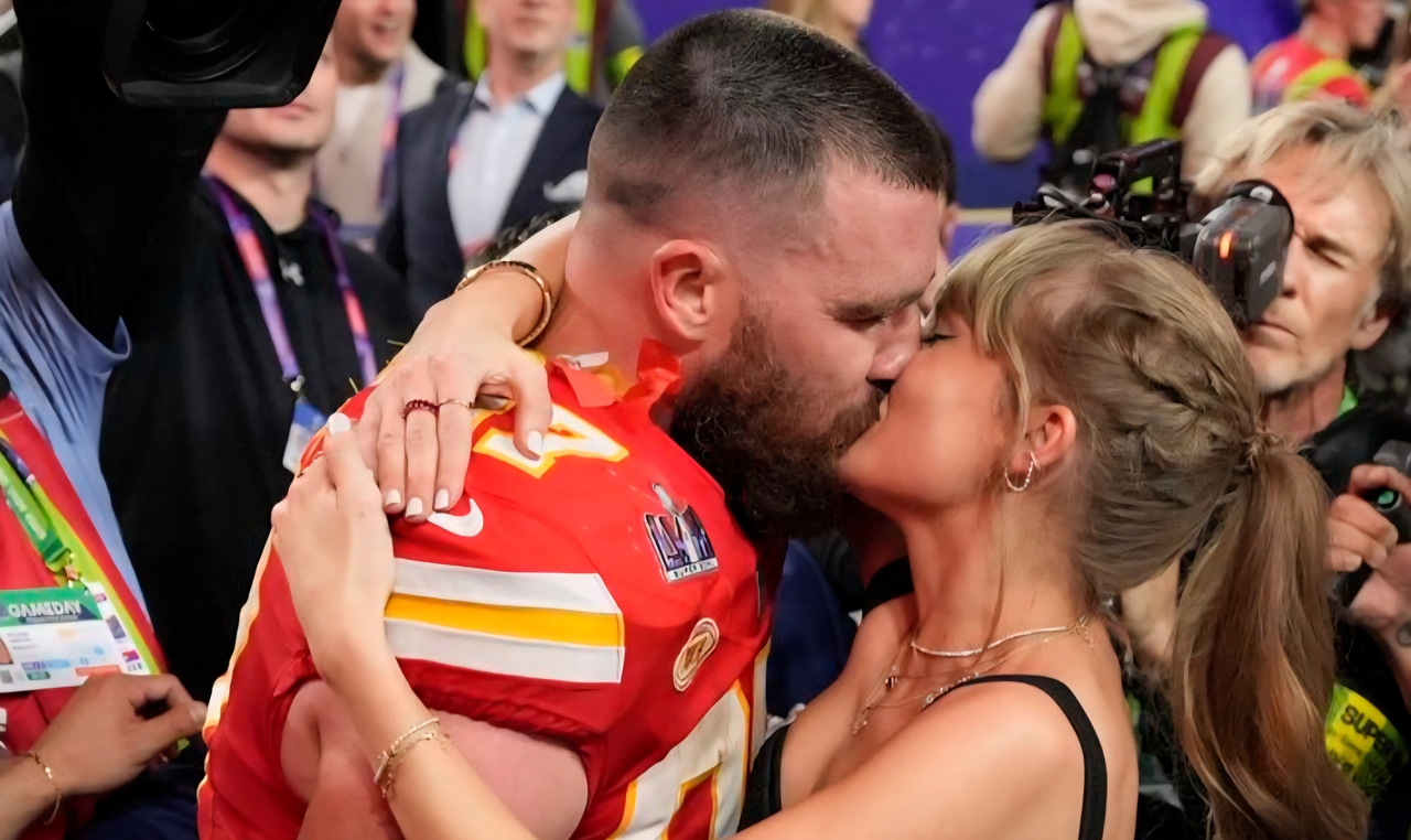 | 테일러 스위프트(오른쪽)가 2024년 2월 네바다주 라스베이거스에서 열린 슈퍼볼에서 우승한 남자친구 트래비스 켈시와 입을 맞추고 있다. [AP] |
