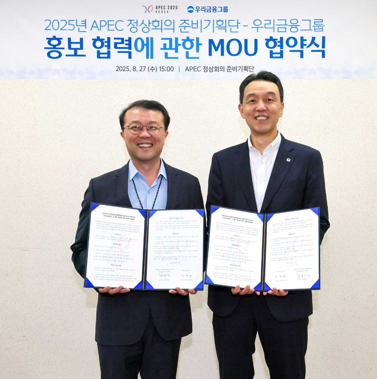 [헤럴드경제=유혜림 기자] 우리금융그룹이 APEC 정상회의 준비기획단과 ‘2025년 APEC 정상회의’ 공식 홍보 협력을 위한 MOU를 체결했다고 28일 밝혔다.