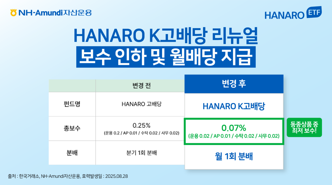 ETF 명칭 변경과 함께 보수 인하도 단행했다. NH아문디자산운용은 투자자들의 장기 투자 시 비용 효율성이 높아질 수 있도록 총보수를 기존 0.25%에서 0.07%로 인하했다. 이는 국내 주식형 고배당 ETF 중 최저 수준이다. 아울러 분배주기도 기존 분기 단위에서 월 단위로 전환한다.