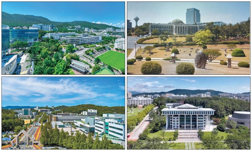 | 교육부가 내년 예산 중 이재명 정부의 교육 핵심 과제인 ‘서울대 10개 만들기’를 위해 거점국립대학에 지난해 대비 4777억원 증가한 8733억원을 집중적으로 투입한다. 사진은 국내 대표 거점국립대학인 부산대(왼쪽 위부터 시계방향), 경북대, 전남대, 충남대 전경 [각 대학 제공] |