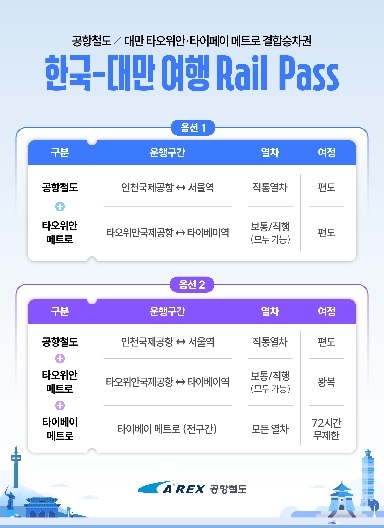 [헤럴드경제(인천)=이홍석 기자]공항철도㈜는 29일부터 대만 타오위안 메트로(Taoyuan Metro), 타이베이 메트로(Metro Taipei)를 한 번에 이용할 수 있는 ‘한국-대만 여행 레일 패스(Rail Pass)’를 출시했다.