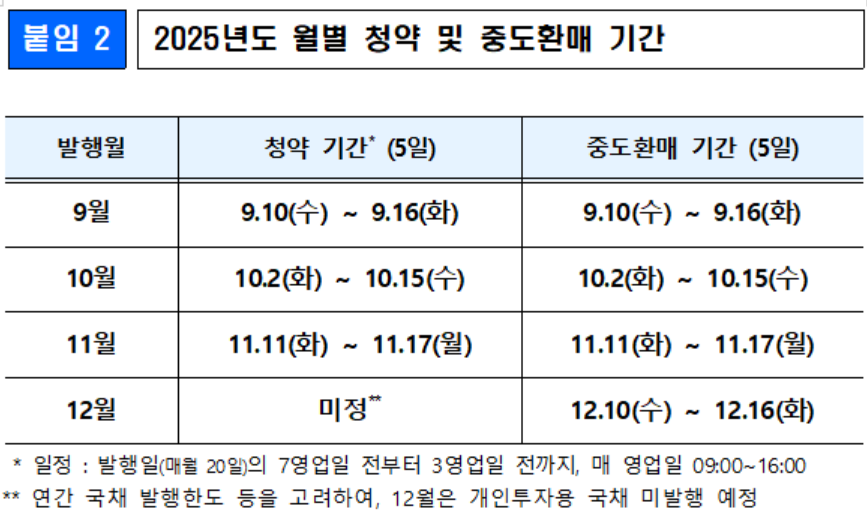 한편, 9월에는 지난해 6월부터 8월까지 발행된 개인투자용 국채의 중도환매가 총 6,000억원 한도 내에서 가능하다. 다만 중도환매 시에는 원금과 표면금리에 따른 단리 이자만 지급되며, 가산금리 적용 복리 이자와 이자소득 분리과세 혜택은 받을 수 없다.