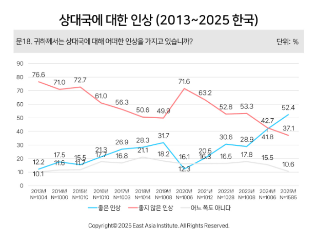 상대국에 대한 인상을 물은 결과 일본에 좋은 인상을 갖고 있다는 한국인은 52.4%로 집계됐다. 이는 지난해 41.8%에서 10.6%포인트 급증한 것으로 집계를 시작한 2013년 이후 최고치다. ‘노 재팬(No Japan)’ 운동이 있던 2020년 12.3%와 비교하면 4배 이상이다.