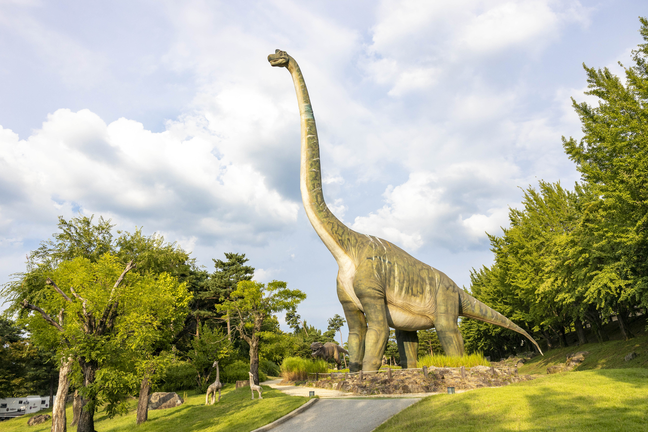 | 가산수피아 숲속에 우뚝 선 42m 브라키오사우루스 로봇. 멀리서도 한눈에 보이는 거대한 모습이 아이들의 시선을 사로잡는다.[칠곡군 제공] |