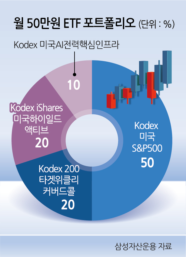 구체적인 포트폴리오로는 ▷KODEX 미국S&P500 50% ▷KODEX 미국AI전력핵심인프라 10% ▷KODEX 200타겟위클리커버드콜 20% ▷KODEX 아이셰어즈 미국하이일드액티브 20%로 구성할 것을 제안했다.