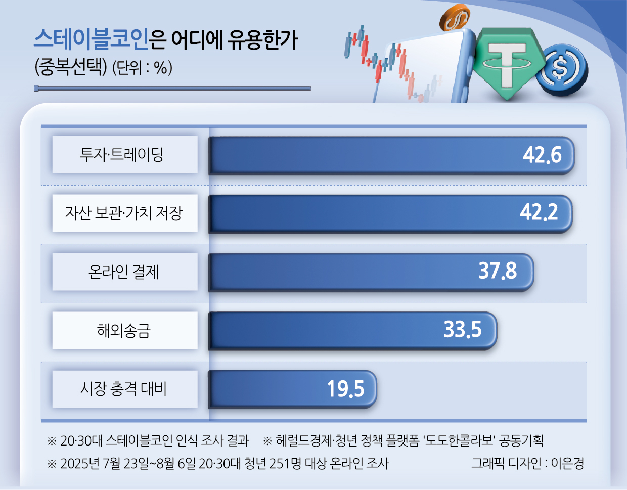 스테이블코인을 향한 청년 세대의 재테크 수요는 유 씨만의 이야기가 아니었다. 실제 청년 세대의 잠재 수요도 컸다. 31일 헤럴드경제와 청년정책 플랫폼 ‘도도한콜라보’와 지난달 23일부터 이달 6일까지 20·30세대 251명(남 125명·여 126명) 대상으로 스테이블코인의 유용성(중복 선택)을 물었더니 10명 중 4명은 자산 관리 수단을 답했다.