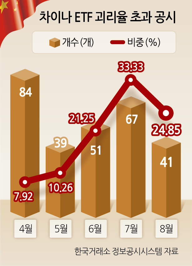 이 같은 괴리율 현상은 중국 관련 ETF에서 특히 두드러진다. 지난해 1년 동안 국내 ETF 시장에서 ‘괴리율 초과 공시’는 총 3000건 발생했는데, 이 가운데 중국 ETF가 차지한 비중이 494건으로 10%를 웃돌았다.