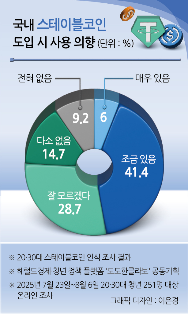 31일 헤럴드경제와 청년정책 플랫폼 ‘도도한콜라보’와 지난달 23일부터 이달 6일까지 20·30세대 251명(남 125명·여 126명) 대상으로 스테이블코인 인식 조사를 한 결과, 전체 응답자의 47.4%가 스테이블코인을 결제나 재테크 등 수단으로 사용하겠다고 응답했다. ‘사용하지 않겠다’는 부정층은 23.9%, ‘잘 모르겠다’고 답한 유보층은 28.7%였다.