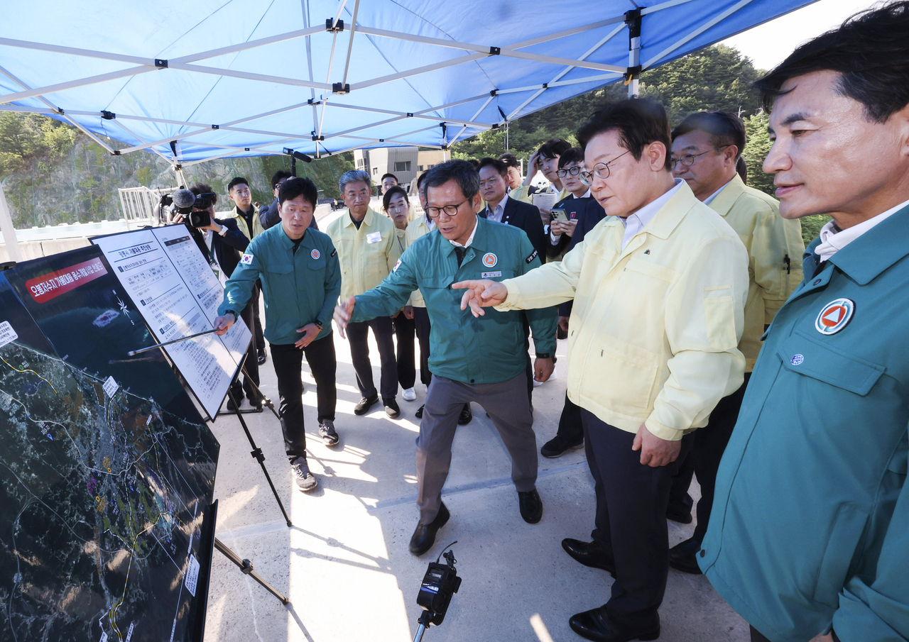 | 이재명 대통령이 지난 30일 강원 강릉시 성산면 오봉저수지를 방문해 가뭄 대응 추진 상황을 점검하고 있다. [연합] |