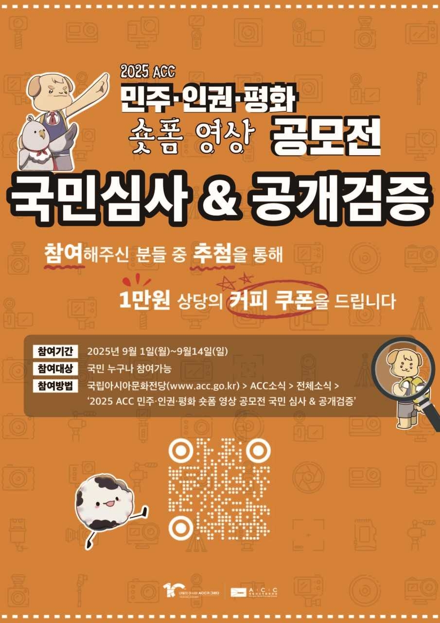 [헤럴드경제(광주)=서인주 기자] 문화체육관광부 국립아시아문화전당(ACC, 전당장 김상욱)이 오는 14일까지 ‘2025 ACC 민주·인권·평화 숏폼 영상 공모전’ 1차 예선 심사를 통과한 작품들을 대상으로 ‘국민심사’와 ‘공개검증’을 실시한다.