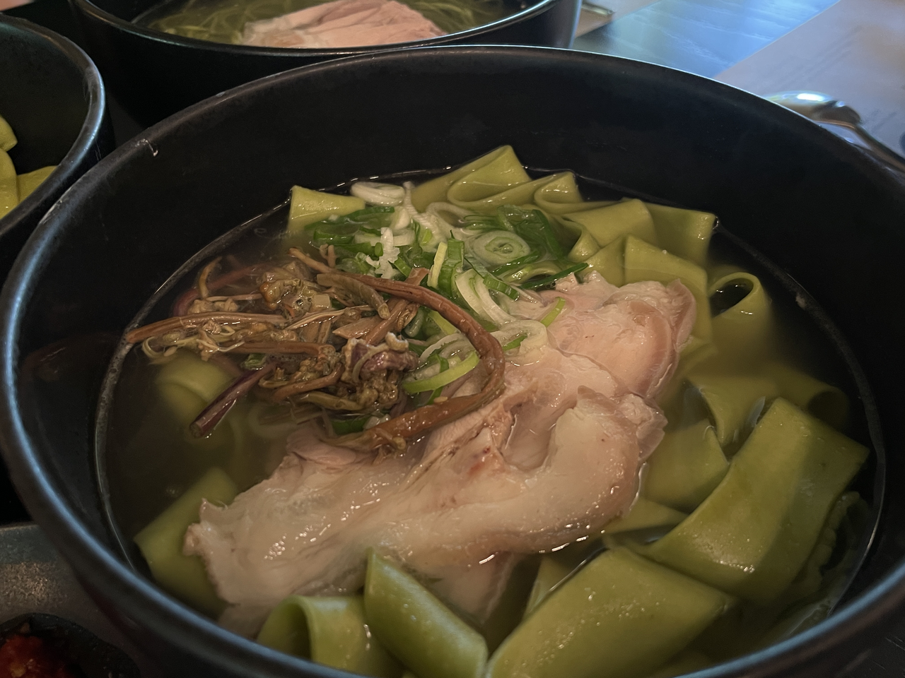 말차 누들바에서 판매 중인 모든 메뉴를 먹어봤다. 말차 면으로 만든 메뉴는 말차 온 국수, 말차 찬 국수, 말차 비빔 국수 총 3가지다. 모두 한 그릇에 1만5000원이다. 돼지 수육과 제주 된장 멜젓 소스를 더한 메뉴도 만나볼 수 있다.