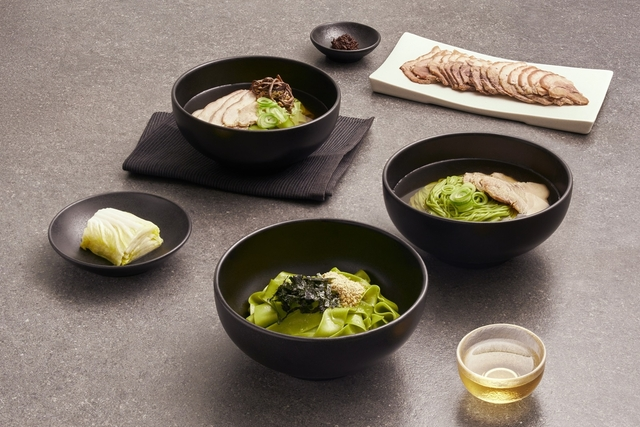 식당 안으로 들어서니 안이 훤히 들여다보이는 제면실과 오픈키친이 한눈에 들어왔다. 제면실에서는 매일 아침 하루에 한 번, 면을 직접 뽑아낸다. 메뉴 개발에는 미쉐린 스타 김도윤 셰프가 함께했다. 17년 이상 면 요리를 연구한 김 셰프는 말차 본연의 깊고 순수한 풍미를 살린 특제면을 개발했다.