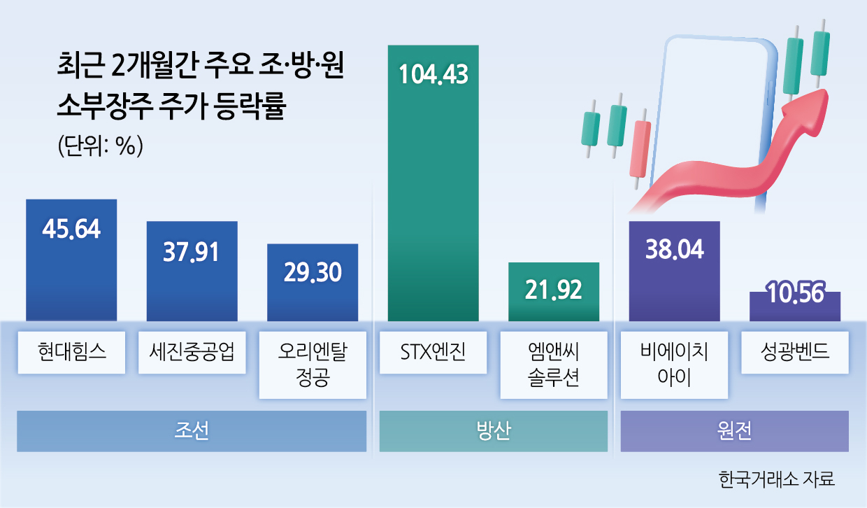 [헤럴드경제=신동윤 기자] 올해 국내 증시의 흐름을 이끄는 주도 섹터로 일명 ‘조·방·원(조선·방산·원전)’이 확고하게 자리 잡았다. 이런 가운데 각 섹터를 대표하는 대형주를 중심으로 달아오른 투자 열기가 관련 ‘소부장(소재·부품·장비)’ 중소형주로도 퍼지는 모양새다.