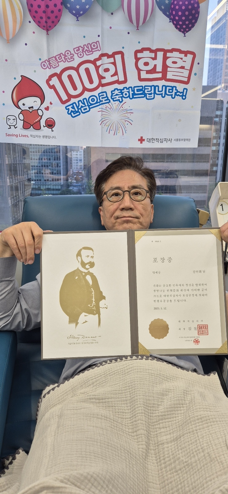 | 김인회 감사위원이 100회 헌혈을 마치며 대한적십자사로 부터 명예상을 수여받았다. |