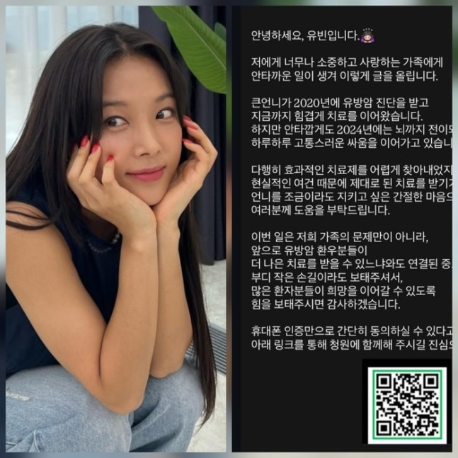 유빈은 1일 사회관계망서비스(SNS)에 “저에게 너무나 소중하고 사랑하는 가족에게 안타까운 일이 생겨 이렇게 글을 올린다”며 “큰 언니가 2020년에 유방암 진단을 받고 지금까지 힘겹게 치료를 이어왔다. 하지만 안타깝게도 2024년에는 뇌까지 전이되어 하루하루 고통스러운 싸움을 이어가고 있다”고 말했다.