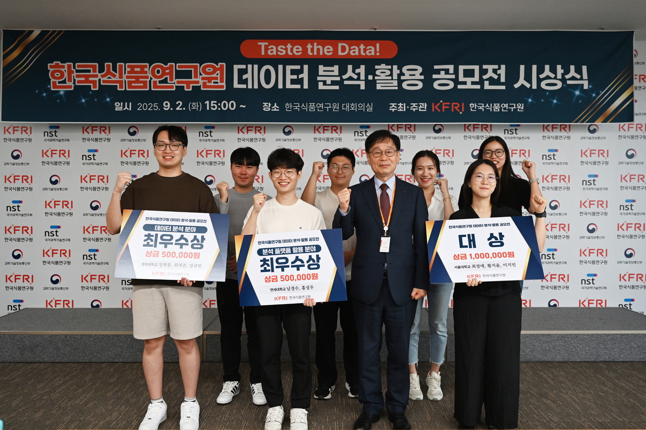 대상은 서울대학교 최경애·황지윤·이지민 팀의 ‘발효식품의 지역별 노출률과 미생물 프로파일 클러스터링을 통한 군집 내 상호 대용 식품 탐색’이 차지했다. 최우수상은 데이터 분석 분야에서 경희대학교 장현종·최재준·강규민 팀의 ‘RAG-FSR(Retrieval Augmented Generation-Food Science Research): 자연어 처리와 검색 강 생성을 통한 식품 연구 저널 분류 언어 모델’, 분석 플랫폼 활용 분야에서 연세대학교 남경수·홍성우의 ‘16S rRNA 동정 데이터로 분리원 예측 모델 구축’이 각각 수상했다.