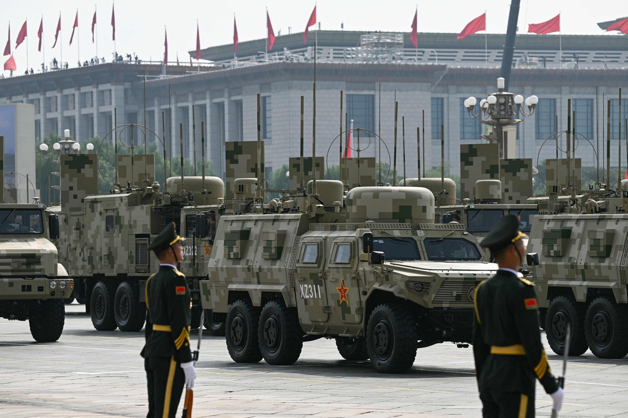 | 3일(현지시간) 중국 베이징 톈안먼 광장에서 열린 ‘중국인민 항일전쟁 및 세계 반파시스트 전쟁 승리(전승절) 80주년’ 열병식 도중 군용 차량들이 보이고 있다. [AFP] |