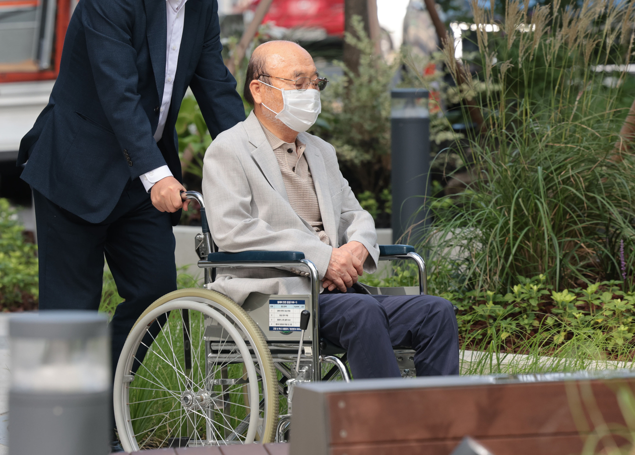 오전에 휠체어를 타고 마스크를 쓴 채 나온 이 회장은 “김 여사에게 6200만원짜리 목걸이를 직접 줬나”, “목걸이 선물과 사위 박성근 전 국무총리 비서실장의 인사 청탁이 연관이 있나” 등 취재진 질문에 답하지 않고 특검팀 사무실에 입장했다.