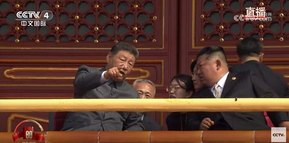 | 3일 중국 인민 항일전쟁 및 세계 반파시스트 전쟁 승리 80주년 대회에 참석한 시진핑 국가주석과 김정은 북한 국무위원장이 대화하고 있다. [중국중앙(CC)TV 유튜브 채널 캡처] |