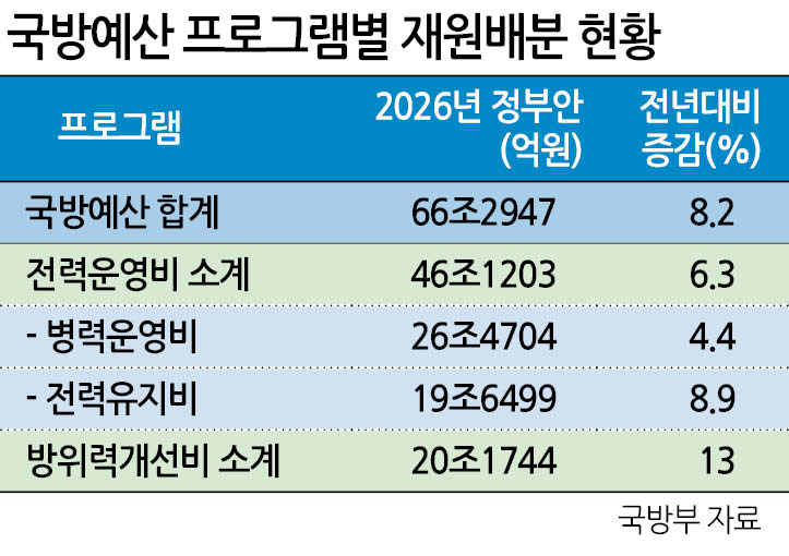 군사력 건설을 위한 방위력개선비가 전년 대비 13% 증가한 20조71744억원, 군사력 운영을 위한 전력운영비가 전년 대비 6.3% 증가한 46조1203억원이다.