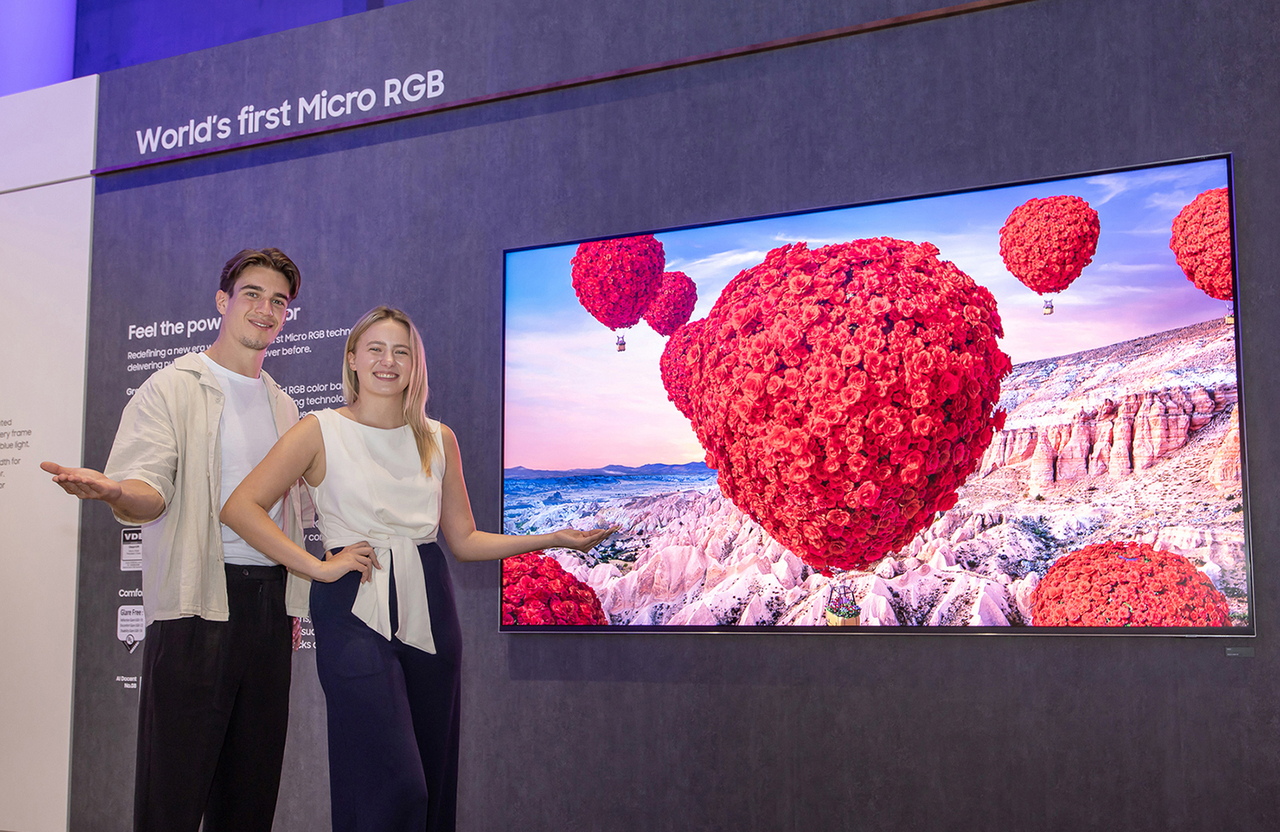 | IFA 2025가 열리는 독일 베를린 메세 베를린의 시티큐브 베를린에 위치한 삼성전자 전시관에서 삼성전자 모델이 세계 최초 115형 마이크로 RGB TV를 소개하고 있다. [삼성전자 제공] |