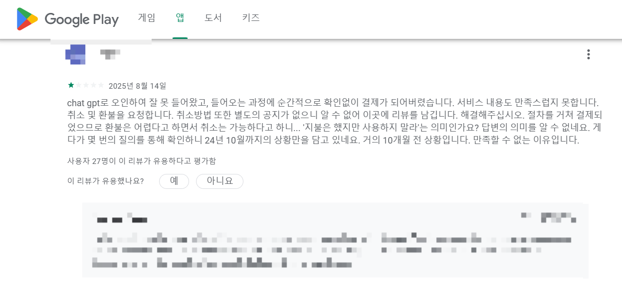 실제 앱마켓 구글플레이와 애플스토어에 ‘챗GPT’를 검색해 본 결과, 챗GPT과 유사한 인공지능(AI) 앱이 여럿 등장했다. 챗GPT를 연상시키는 이름의 앱이 줄을 이었다. 김씨가 사용했던 앱 리뷰에는 “챗GPT로 오인해 잘못 들어왔고, 그 과정에서 확인 없이 결제가 됐으니 주의하라”는 평가가 이어지고 있었다.