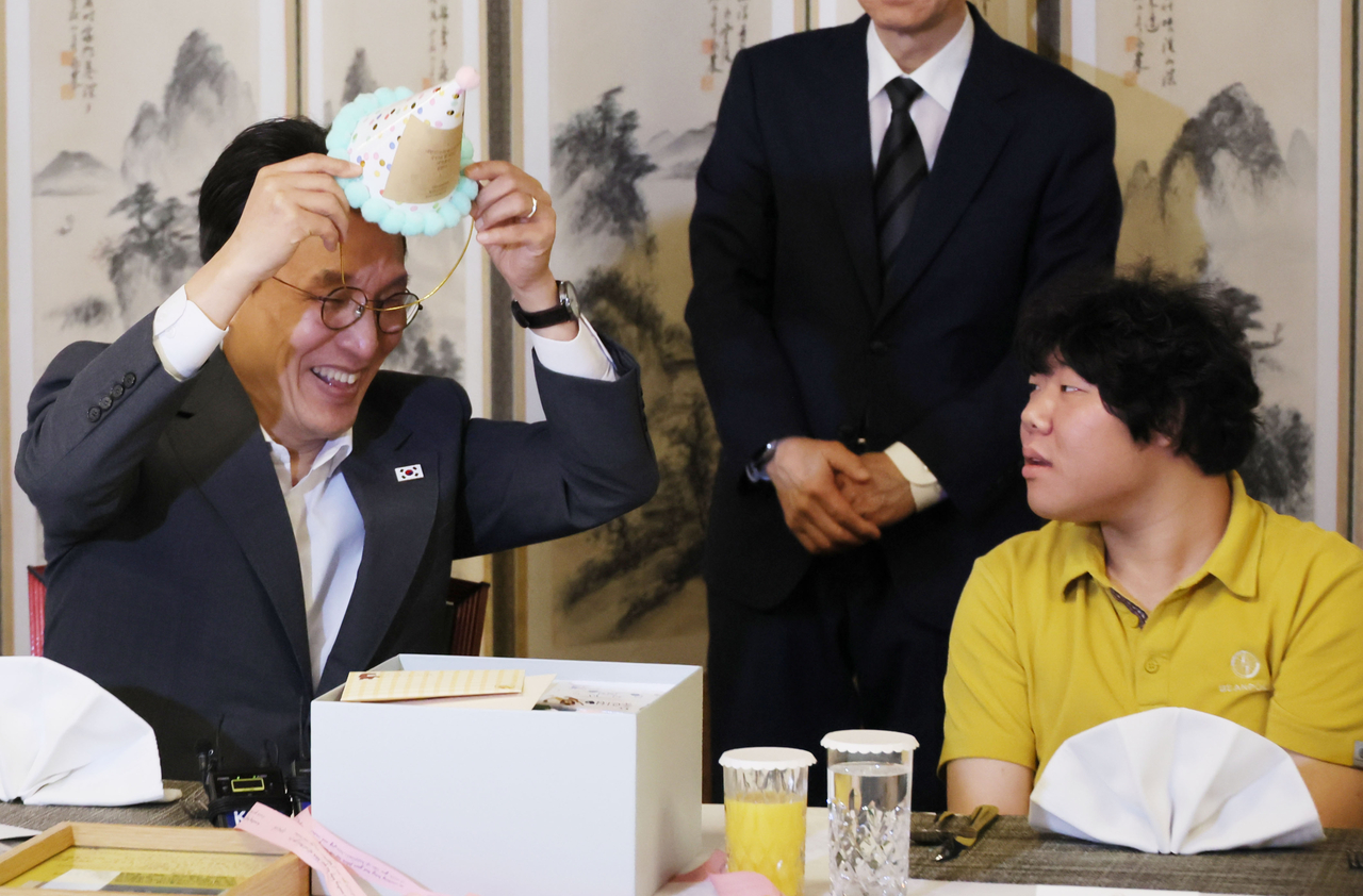 | 김민석 국무총리가 4일 서울 종로구 총리공관에서 열린 발달장애인 가족 공관초청 행사에서 발달장애인들로부터 선물 받은 고깔모자를 써보고 있다. [연합] |